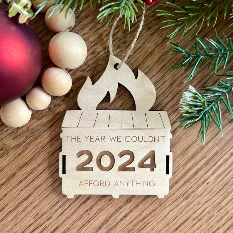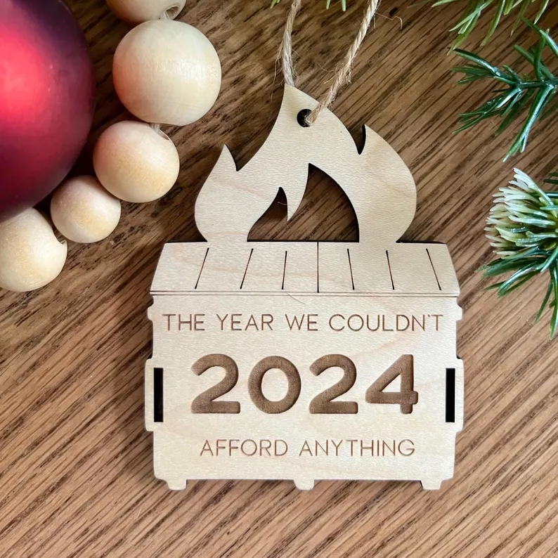 Capture the humor and resilience of the year with our Wooden Engraved Christmas Ornament shaped like a dumpster on fire, featuring the candid phrase "The Year We Couldn't Afford Anything." Crafted from sturdy wood and meticulously engraved, these ornament offer a tongue-in-cheek reflection on the challenges we've faced.
